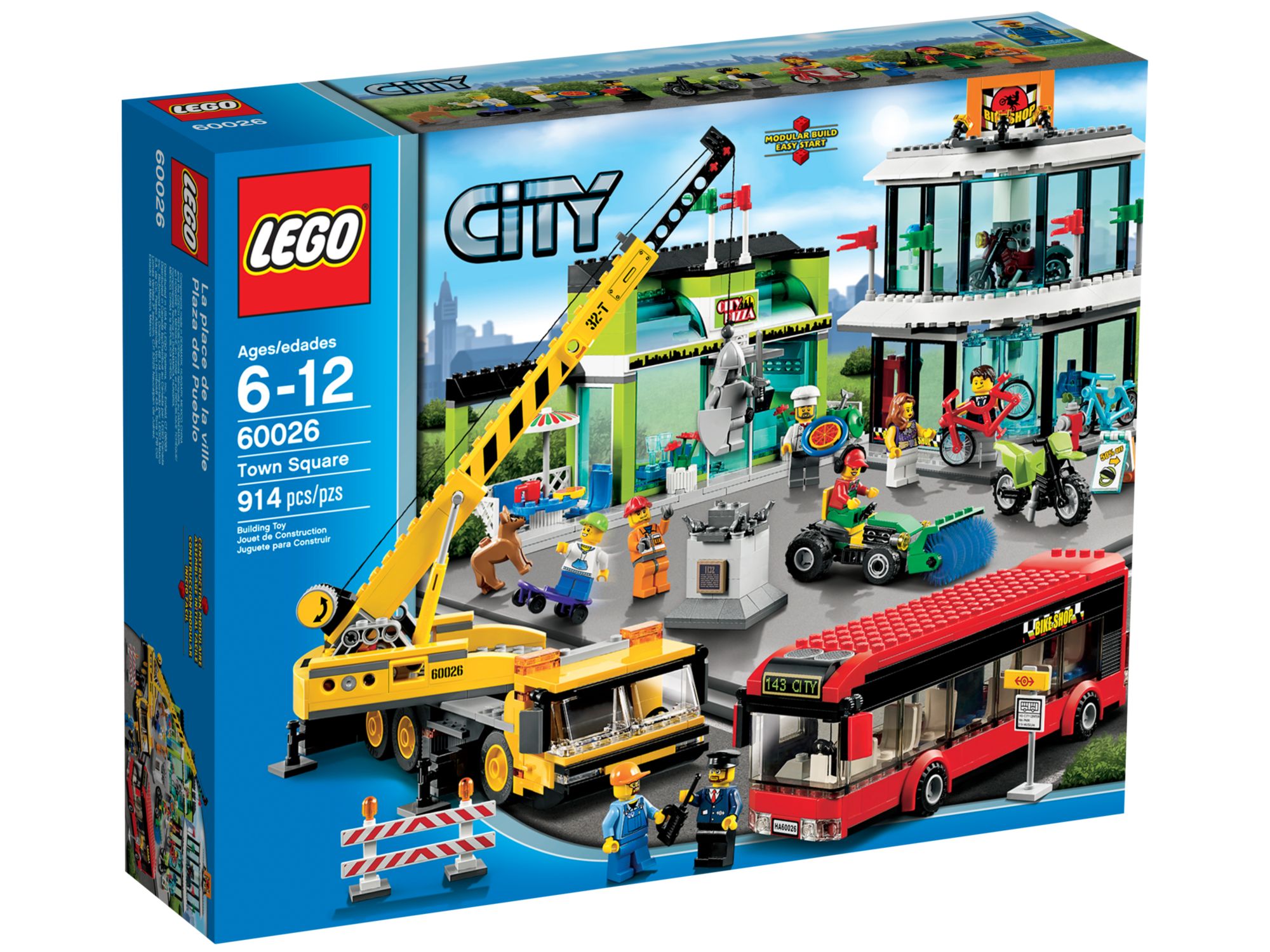 One of the sets, Town Square 60026 stands out from the rest. In the box are pieces to build two buildings, three vehicles, eight minifigures (nine if you include the statue), a dog and plenty of accessories.