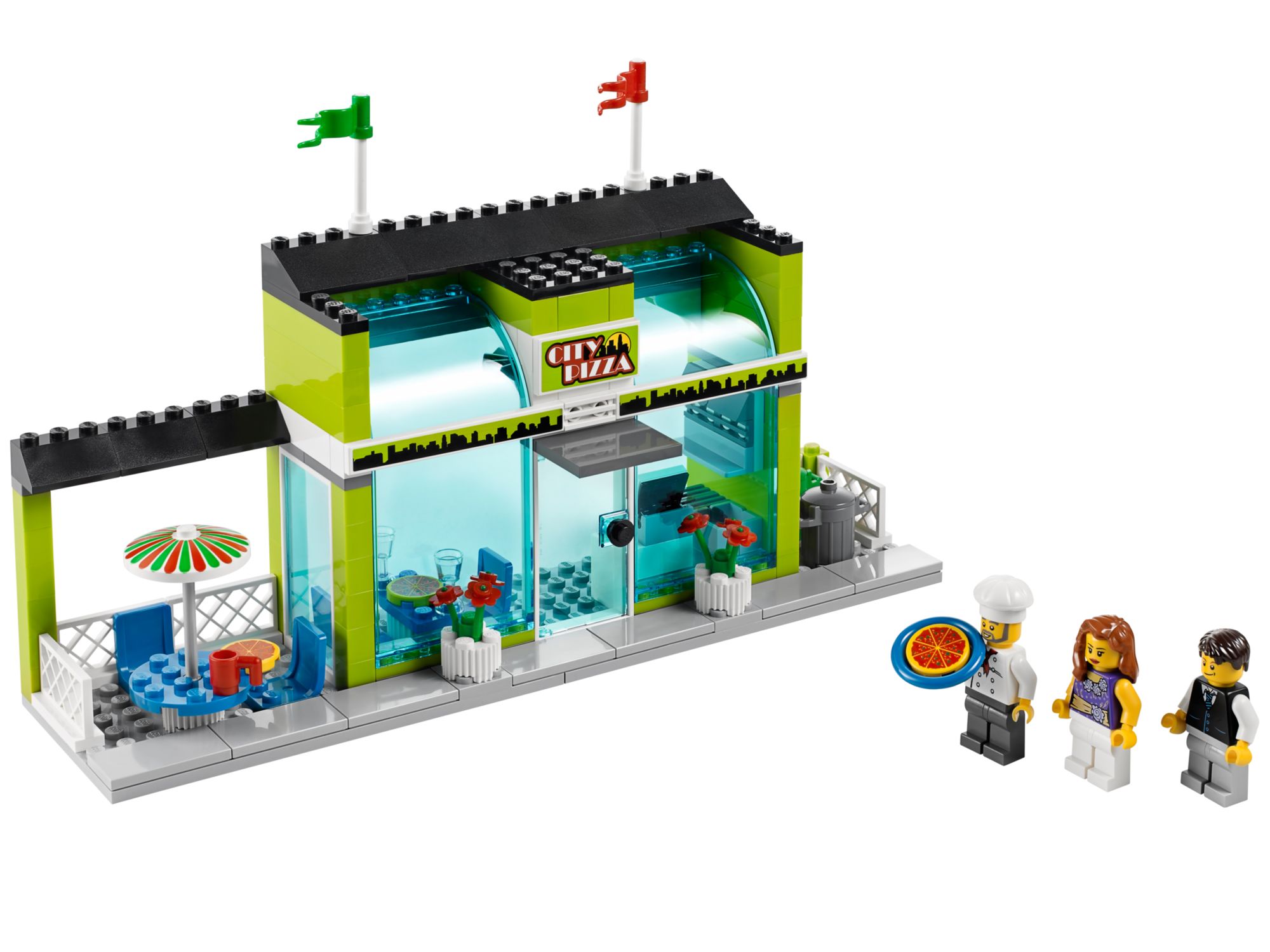 The buildings included in this set are a pizzeria with indoor and alfresco dining. The second building is a corner two storey bike showroom. There are two bicycles and two motorbikes included for filling the showroom.