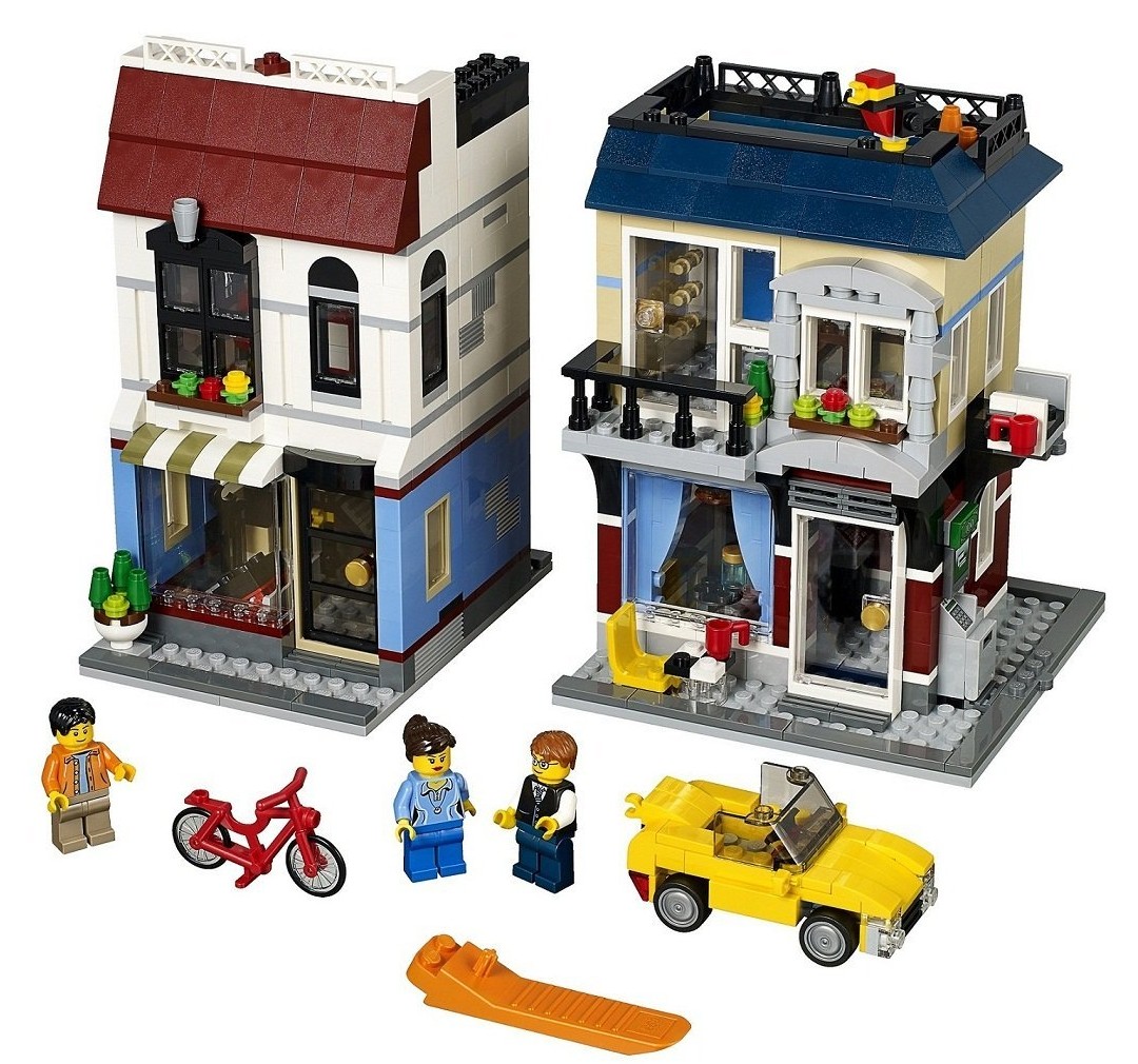 Both buildings can also be rebuilt into an auto repair shop or a flower shop. The set includes 3 minifigures and a bicycle.