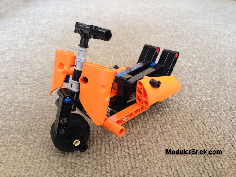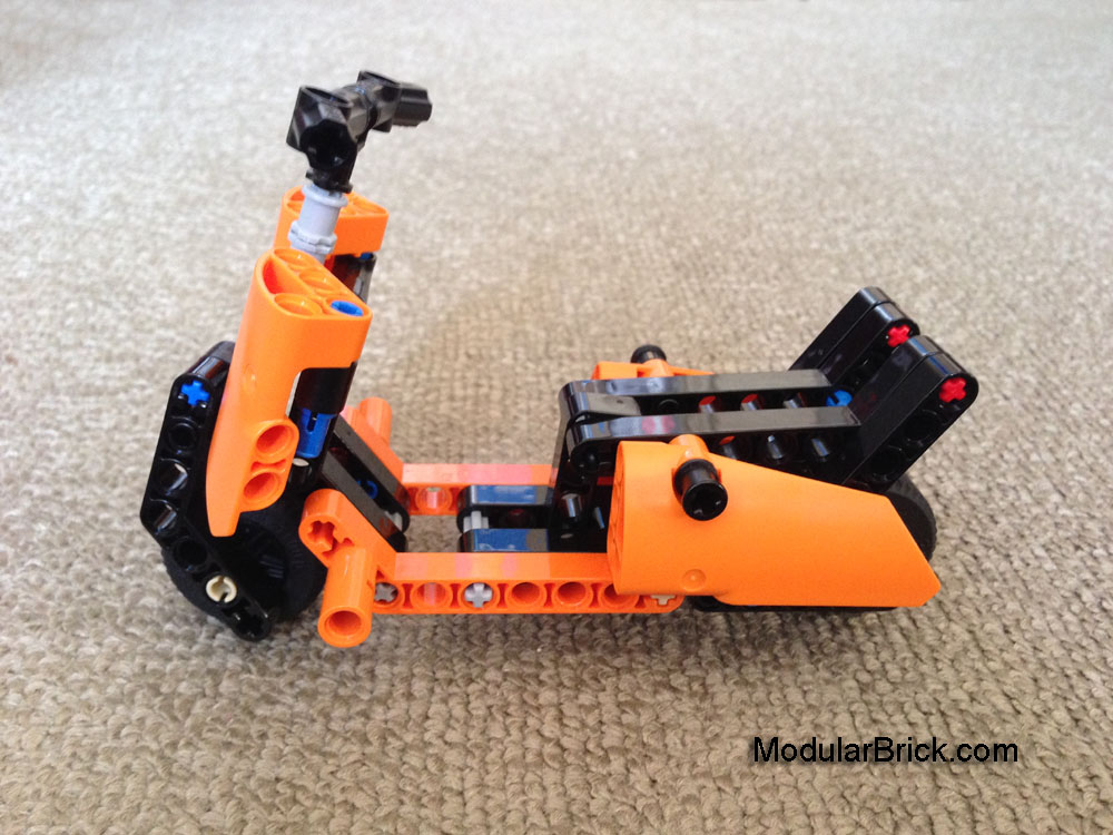 In the set, there are also 2 angled orange colored technic beams. These orange beams could be used to form the lower chassis linking the front to rear of the scooter.